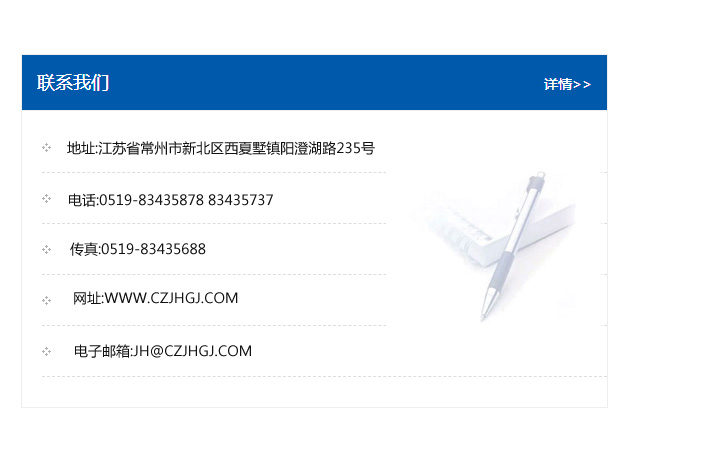 傳真:0519-83435688    郵編:213135    網(wǎng)址:WWW.czjhgj_com.ynhuotang.com    電子郵箱:JH@czjhgj_com.ynhuotang.com